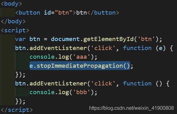 - event.stopImmediatePropagation() 阻止事件冒泡并且阻止相同事件的其他侦听器被调用(事件响应优先级)。如:一个按钮依次注册了 a、b 两个点击事件,如果希望点击 a 的时候不要触发 b,这用这个函数。